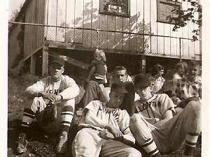 Photo of Howard Palmer taken on Allentown School Grounds. Adams house on left, Howard Gowdy's Oil Tank, Back of (then) Jandrew's Store.