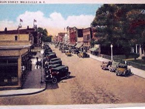 WELLSVILLE VILLAGE HALL From Photo Collection of Donald Adams -copyright 2004 Don Adams. Down Madison Street; Burned April 1, 1952. 3rd Floor had basketball…